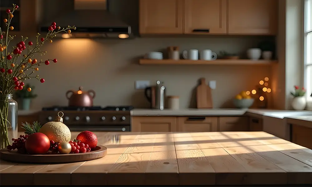 Em cozinhas pequenas, a bancada funciona como base para preparo, apoio e circulação. Por isso, escolha apenas um destaque visual, como um arranjo baixo ou uma bandeja bem composta. Um único ponto decorativo deixa o ambiente festivo sem comprometer o dia a dia.
